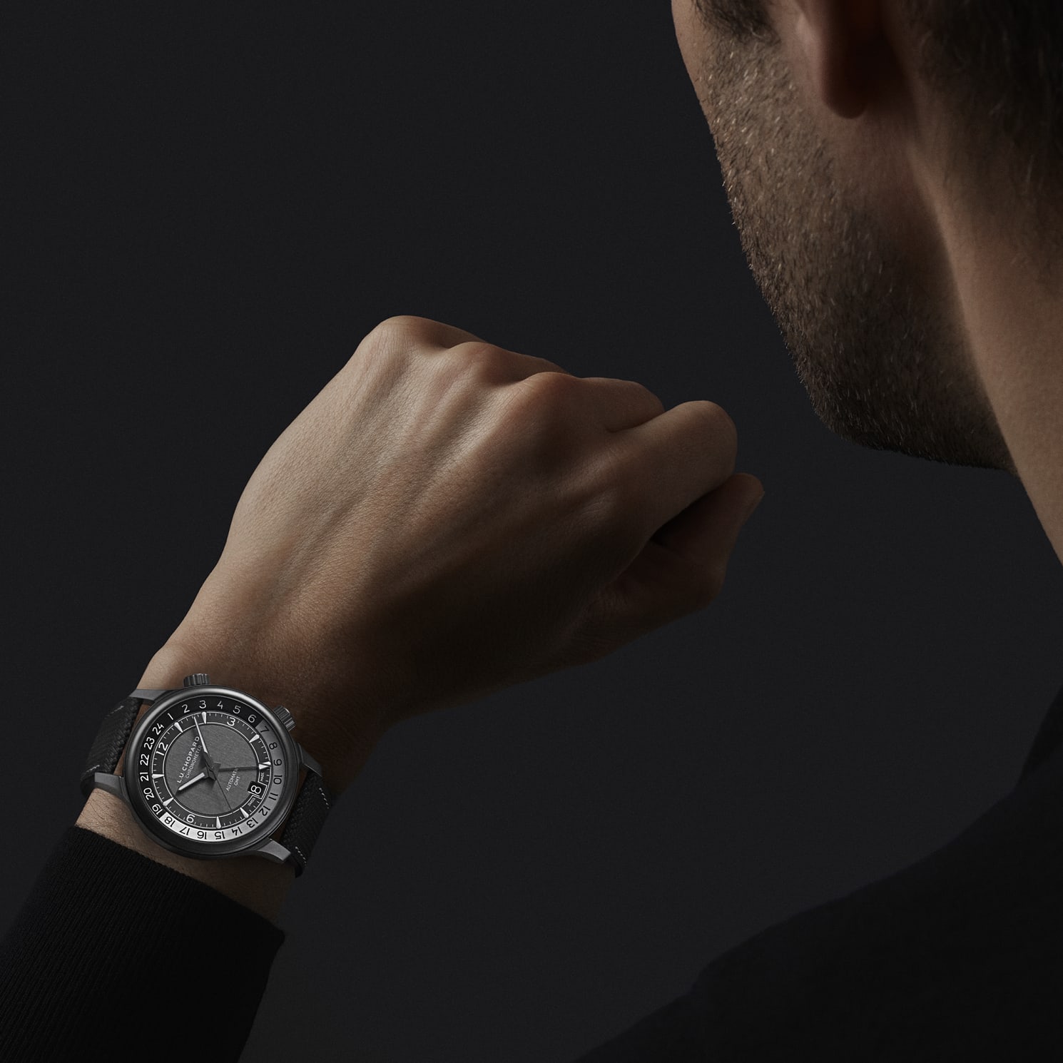 表盘设计简洁而富有层次感,深灰色表盘采用垂直缎纹打磨效果,时标和阿拉伯数字覆以Super-Luminova®荧光涂层,确保在任何光线下都能清晰读取时间。GMT功能显示位于表盘外表圈,由GMT指针清晰指示第二时区时间,让旅行者轻松掌握两地时间。